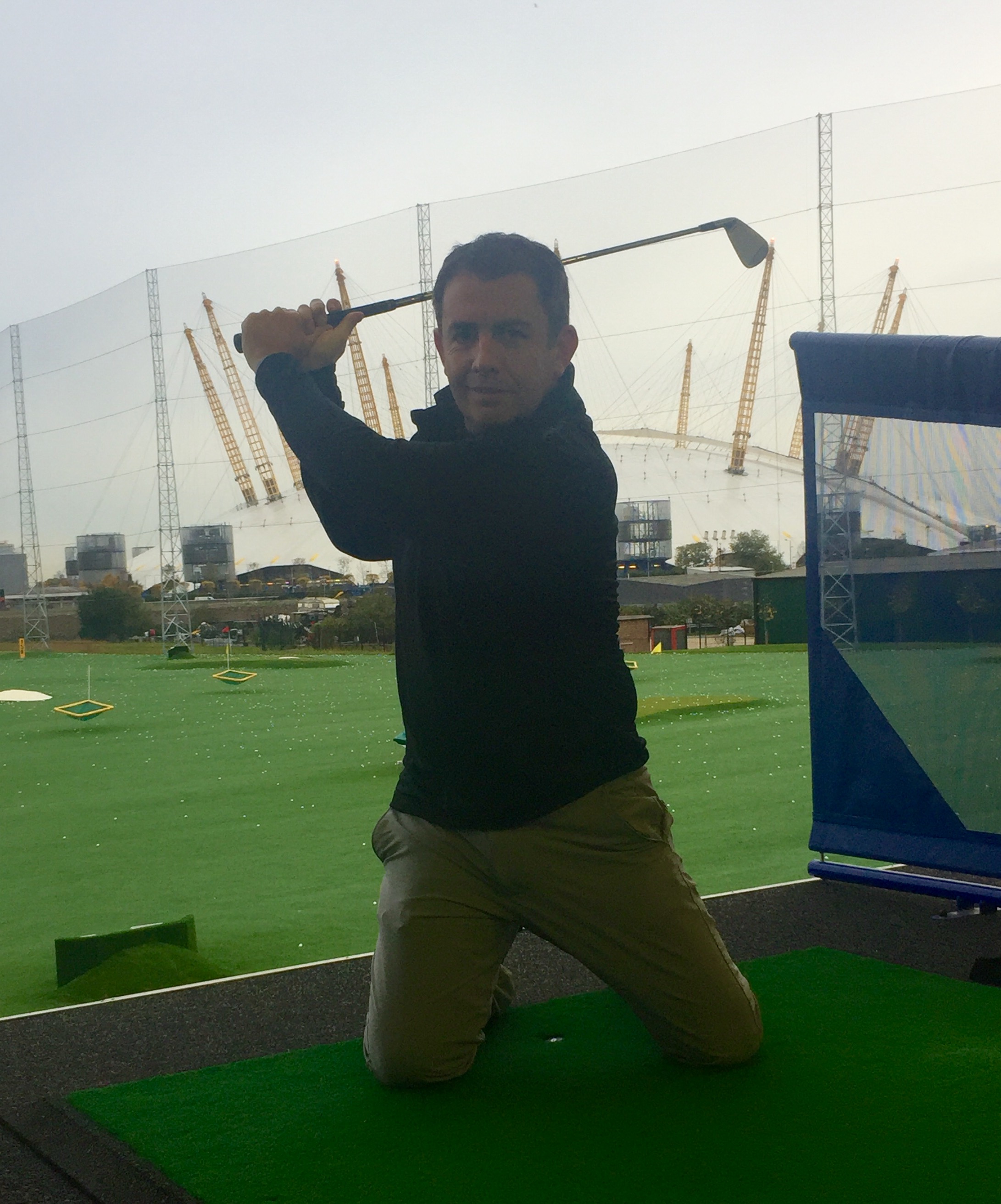 Get onto your knees with a golf club. Set your knees apart so that it feels like you are addressing the ball and make a backswing.